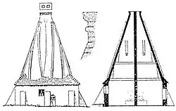 „Diese eigenartige Konstruktion musste besonders gesichert werden. Wir finden in den vier Ecken des Baues 1 1⁄a Stein starke Pfeiler, ferner an jeder geraden Seite des Rauchfanges drei Rippen, 1 Stein breit nach außen 1⁄a Stein stark hervortretend, ebensolche an den gerundeten Teilen des Rauchfanges und schließlich in seinem Innern eine Anzahl kurzer, nach oben auslaufender Rippensätze, die auf zu Verankerung dienenden Balken sitzen. Die Standfestigkeit des Rauchfanges hat trotzdem gelitten.“[1]