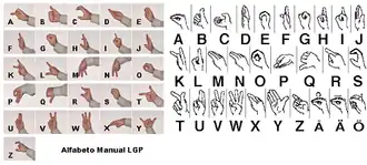 Die LGP wird hauptsächlich von Gehörlosen in Portugal verwendet. Sie ist in der Verfassung Portugals anerkannt.[19] Sie erhielt einen starken schwedischen Einfluss, da auf Gesuch des Königs im 19. Jahrhundert von dem Schweden Pär Aron Borg 1823 in Lissabon eine Gehörlosenschule gegründet wurde.[20][21] Obwohl der Wortschatz von LGP und STS Unterschiede aufweist, zeigt das Fingeralphabet ihren gemeinsamen Ursprung.[22]