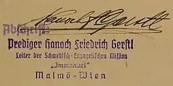 Ein Schwede österreichisch-jüdischer Abstammung, der evangelische Christ Hanoch Gerstl (1899–1956)[90], war eher freikirchlich orientiert[91]. Er arbeitete zwar nicht mit der Israelmission in der Seegasse zusammen, leitete jedoch die schwedische evangelische Mission Immanuel. Er versuchte in Wien ab 1937 einen judenchristlichen Kreis aufzubauen.[92] Ende 1941 oder etwas später verließ er Wien.[93]