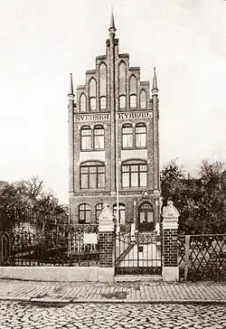 Das Gebäude, dessen Front mit der Jugendstil-Aufschrift Svenska Kyrkan oberhalb des zweiten Obergeschosses versehen wurde, hat keinen Glockenturm. Der Treppengiebel wurde auf den unteren Stufen rechts und links mit je einem Türmchen versehen, die jeweils einen stilisierten Anker trugen. Von ihnen ist nur der linke erhalten. Auf der höchsten Stufe des Giebels befindet sich noch das Kreuz mit Strahlenkranz. Die Straßenseite des Backsteingebäudes mit Stilelementen der Gotik und Renaissance ist mit grün glasierten Ziegeln versehen.