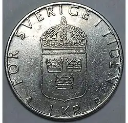 Traditionell trägt die schwedische Ein-Kronen-Münze auf der Aversseite das Bild (Umrisszeichnung) des amtierenden schwedischen Monarchen und bis 2000 eine Darstellung des Staatswappens von Schweden auf dem Münzrevers. Außerdem ist das königliche Motto in die 10-Kronen-Münze geprägt. Die 2017 eingeführten Münzen haben als Thema Sonne, Wind und Wasser.[17]