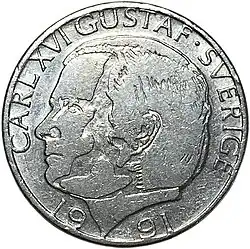 | 10 Kronen | Ernst Nordin und Marita Norin | 89 % Cu, 5 % Al, 5 % Zn, 1 % Sn | 6,6 g | 20,5 mm | 2,9 mm | 1991 bis heute | ||