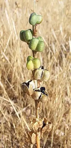 Die lokulizidale Kapselfrucht ist fast kugelig bis verkehrt-eiförmig mit einem Durchmesser von 8 bis 10 mm. Die bräunlich-schwarzen, glänzenden Samen besitzen einen schmalen Flügel.