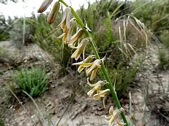 Der Blütenstandsschaft weist eine Länge von meist 20 bis 70 (10 bis 100) cm auf. Selten 3 bis meist 10 bis 16 Blüten stehen in einem lockeren, mehr oder weniger einseitswendigen, traubigenBlütenstand mit 8 bis 12 (bis 20) mm langen, lanzettlichen Tragblättern zusammen. Die Blütenstiele sind 5 bis 10 mm lang. Die zwittrigen, dreizähligen Blüten sind schmal glockenförmig. Es sind zwei Kreise mit je drei 12 bis 18 mm langen Blütenhüllblättern vorhanden. Ihre Farbe ist gelblich, bräunlich oder grünlich. Am Grund sind sie zu einem Viertel oder bis zur Hälfte verwachsen. Die drei äußeren Blütenhüllblätter sind bis zur Mitte und die drei inneren sind nur die Spitze rückwärts gekrümmt. Es sind zwei Kreise mit je drei Staubblättern vorhanden; ihre kurzen Staubfäden entspringen in der Blütenhüllblattröhre und die Staubbeutel sind 2 bis 4 mm lang. Drei Fruchtblätter sind zu einem dreikammerigen, 3 bis 5 mm langen Fruchtknoten verwachsen. In jeder Fruchtknotenkammer befinden sich etwa 20 Samenanlagen. Der 3 bis 4,5 mm lange Griffel endet in einer dreilappigen Narbe.