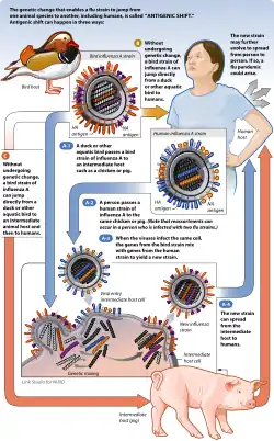 Genom-Analyse des Schweinegrippe-Virus legt Überwachung von Erkrankungen bei Schweinen nahe. H1N1: Ursprünge und Evolution der gegenwärtigen Epidemie. Genom-Analyse zeigt, dass aktuelles H1N1-Virus Monate vor dem Bekanntwerden des Ausbruchs auf Menschen übergegangen ist. organische-chemie.ch, 11. Juni 2009; abgerufen am 7. Oktober 2012. In der Zusammenfassung von Origins and evolutionary genomics of the 2009 swine-origin H1N1 influenza A epidemic heißt es: „Rambaut konnte zeigen, dass der aktuelle Virus die Kombination unterschiedlicher Viren im Schwein als Mischgefäss ist, daher ein spezifischer Ursprung nicht festgemacht werden kann, und dass die Übertragung zum Menschen schon Monate vor dem Bekanntwerden des Ausbruchs stattgefunden haben muss. Schon Jahre vor dem eigentlichen Ausbruch der Krankheit könnten Gene, die nun im Virus enthalten sind, neu kombiniert worden sein.“ - ↑ R. E. Shope: An intermediate host for the swine influenza virus. In: Science. 1939, Band 89, Nr. 2315, S. 441–442, PMID 17816951.