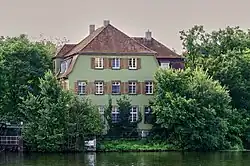 Die Farbmühle wurde im Stil des Vorgängers neu errichtet und prägt mit ihrem Mansardwalmdach als sogenanntes „Grünes Haus“ noch heute das Mainufer. In der ersten Hälfte des 19. Jahrhunderts wurde die Industrialisierung entlang des Schweinfurter Mainabschnitts weiter vorangetrieben. Mit dem ersten modernen Technikgebäude, einer amerikanischen Kunstmühle, einer Loh-, Walk- und Schleifmühle und einer fünf Stockwerke hohen Spinnmühle entstand zwischen 1841 und 1846 das sogenannte „Main-Etablissement“. Das Ensemble besteht noch heute, wurde allerdings nach einem Brand 1911 rekonstruiert und wird nicht mehr industriell genutzt.[29]
