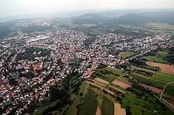 Schweinheim vom Erbig aus gesehen; in der Mitte die Pfarrkirche Maria Geburt