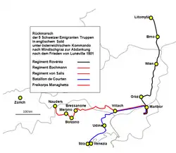 (11aus) Emigranten-Regiment Rovéréa 1799–1801[2][16][17] (12aus) Emigranten-Regiment Bachmann 1799–1801[2][16][17] (13aus) Emigranten-Regiment Salis 1799–1801[2][16][17] (14aus) Emigranten-Regiment Paravicini 1799[2][16][17] (15aus) Emigranten-Bataillon Courten 1800–1801[2][16][17] (16aus) Freikorps Managhetta 1799–1801[2][16][17] | |