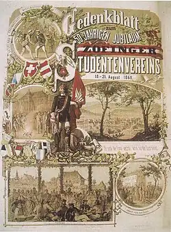 Berner Studenten aus dem Umfeld des Professors Johann Rudolf Wyss, Albert Bitzius, dessen Vetter Karl Bitzius und Gottlieb Studer,[12] organisierten im Juni 1818 eine Feier im Angedenken an die Schlacht bei Laupen. Dieselben Initianten gehörten zu den ersten Berner Studenten, die ein Jahr später nach Zofingen fuhren. Zürcher Studenten luden ihre Berner Kommilitonen ein, um am 23. Oktober 1818 das 300. Jubiläum des Tages zu feiern, an dem Ulrich Zwingli das erste Mal das Evangelium verkündet hatte.[13] Man pilgerte an die Todesstätte Zwinglis, in den Sihlwald. Später luden die Berner ihre Zürcher Kommilitonen nach Bern ein. Es kam die Idee auf, im aargauischen Städtchen Zofingen – ungefähr in der Mitte zwischen beiden Städten – einen eigenen Studentenverein zu gründen. Vom 21. bis 24. Juli 1819 trafen sich 26 Zürcher und 34 Berner deshalb in Zofingen und gründeten den «Schweizerischen Verein Studierender»,[14] der sich wenig später Zofingerverein oder «Zofingia» nannte.[15] Im Ausland Studierende brachten die Gepflogenheiten der deutschen Burschenschaften mit nach Hause in die Schweiz.