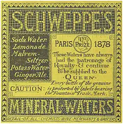 In den 1870er Jahren brachte Schweppes Tonic Water und Ginger Ale auf den Markt.[6] 1897 ging Schweppes an die Londoner Börse.[16] Es entstanden neue Werke in Colwal und Hendon.[4] Bis in die 1950er blieb der Markterfolg von Tonic Water fast ausschließlich auf das Vereinigte Königreich beschränkt und wurde erst ab 1953 in den Vereinigten Staaten populär, als Schweppes dort mit der Abfüllung begann. In den folgenden Jahrzehnten manifestierte sich dann auch der Erfolg in Europa.[6]