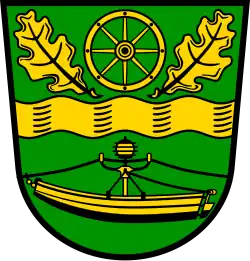 In Grün ein goldener Wellenbalken; oben ein goldenes Wagenrad, beiderseits begleitet von einem goldenen Eichenblatt, unten ein goldener Fährbuchtnachen mit Topplicht.