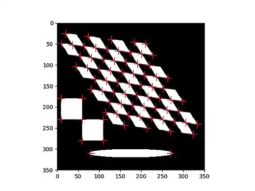 In diesem Beispiel wird ein Schachbrettmuster data.checkerboard() erzeugt und anschließend mit einer affinen Abbildung verzerrt. Nachdem noch weitere Elemente dem Bild hinzugefügt worden sind, werden Eckpunkte mit Hilfe des Harris Corner Detectors, eines Interest-Operators, ermittelt.