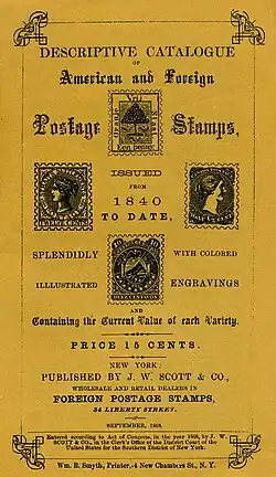 Der erste Scott-Katalog war eine 21-seitige Broschüre. Er wurde 1868 veröffentlicht von John Walter Scott, einem frühen Briefmarkenhändler in New York und behauptete, alle Briefmarken der Welt aufzulisten, jeweils mit Preisangabe. Dieser ursprüngliche Originalkatalog wurde später nachgedruckt.