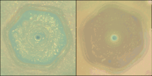 Das polare Sechseck des Saturn wurde 1981 von der Voyager-Mission entdeckt[13] und 2006 von der Cassini-Mission erneut besucht.[14] Cassini konnte nur thermische Infrarotbilder des Sechsecks aufnehmen, bis der Nordpol des Saturns im Januar 2009 in das Sonnenlicht eintrat.[15] Cassini konnte auch ein Video des sechseckigen Wettermusters aufnehmen, während es sich mit der gleichen Geschwindigkeit wie der Planet bewegte und somit nur die Bewegung des Sechsecks aufzeichnete.