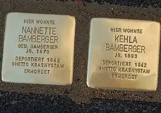 Seine Ehefrau Nannette und Tochter Kehla (geboren 1893) wurden am 24. April 1942 von Bad Kissingen über Würzburg ins Ghetto Izbica deportiert, wo sie wohl in einem der nahen Vernichtungslager zu Tode gekommen sind. Zu beider Gedenken verlegte Gunter Demnig, Initiator der internationalen Aktion „Stolpersteine“, am 22. September 2010 in Bad Kissingen zwei solcher Steine vor ihrem früheren Kurheim „Adelaide“ (Promenadestraße 17) in den Bürgersteig.