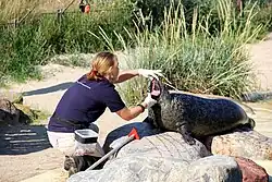 Zudem leben fünf Seehunde und zwei Kegelrobben dauerhaft in einem naturnah angelegten 800 m³ großen Becken. Jährlich verfolgten etwa 150.000 Besucher die mehrmals täglich erfolgenden Fütterungen.[1]
