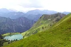 | Seeköpfle (Bergspitze über dem Wasserlauf) von Süden aus dem Gebiet der Lugenalpe. | ||