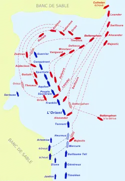 Seeschlacht bei Abukir 1798: Aufstellung der französischen Flotte (blau) in Linie als schwimmende Küstenbatterie vor Anker und Zangenangriff/Durchbruch der englischen Flotte (rot)