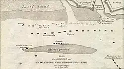Angesichts der Überlegenheit der Briten und der Vernachlässigung ihres Schutzes stand Kommodore Olfert Fischer, der mit der Verteidigung beauftragt wurde, vor massiven Schwierigkeiten.[A 1] Es gab lediglich einen einzigen Zugang in den Seehafen, den Kronlobet Kanal. Im Hafen befand sich die Dänische Flotte. Würde es den Briten gelingen, am Eingang des Kanals auch nur ein einziges der älteren Schiffe zu versenken, wäre die gesamte Flotte gefangen und nutzlos gewesen. Wenn die britischen Bombarden sich im Drogden in einer Linie positionierten, könnten sie mit ihrer überlegenen Reichweite den Hafen, die Werften und Teile der Stadt bombardieren, ohne selbst getroffen zu werden. Die Dänen hatten daher ihre Schiffe als schwimmende Batterien in einer Verteidigungslinie in Nord-Süd-Richtung direkt vor der Sandbank der Insel Amager zusammengefasst, um so zusammen mit den am nördlichen Ende der Sandbank gelegenen Batterien der Trekroner-Festung(55° 42′ 10″ N, 12° 36′ 48″ O) und anderer Landbatterien den Hafen zu schützen. Doch auch diese Art der Verteidigung hatte ihre Schwachstellen. Im Süden war sie anfällig für Breitseiten auf die Längsachsen der Schiffe, und im Norden blockierte sie die Küstenbatterien an der Nyholm-Werft.[10]