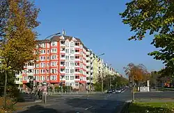 Das Mehrfamilien-Mietshaus an der Ecke Cornelius-Fredericks-Straße wurde 1899/1900 nach Plänen von Arnold Kuthe errichtet und mit zahlreichem Bauschmuck verziert, der vollständig erhalten geblieben ist. In diesem Abschnitt, zwischen Afrikanischer Straße und Müllerstraße, erweckt die Ringstraße den Eindruck eines großstädtischen Boulevards. Besonders auffällig sind hier die Berliner Ecke und die in beide Straßen hineinragenden Ladengeschäfte im Erdgeschoss. Die Fassaden sind verputzt, mit einer Quaderung und mit ornamentalen Jugendstilreliefs versehen. Turmerker mit zierlichen Dachhauben sowie Balkone, angeordnet zwischen den Erkern, verstärken die prachtvolle, einem Boulevard angemessene Erscheinung.[14]