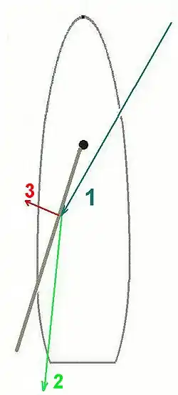 Die am Segel entlang streichende Luft bewirkt eine Kraft, die etwa am ersten Drittel angreift und im Wesentlichen senkrecht zum Tuch steht. Sie ist das Resultat unterschiedlicher aerodynamischer Vorgänge: