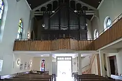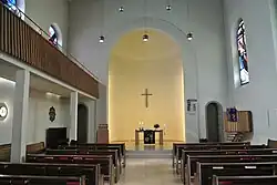 Der Innenraum ist geprägt von dem großen Bogen in der Wand vor dem Chor und der sichtbaren Dachkonstruktion. Die Gestaltung der Holzbalken greift das neoromanische Motiv der Rundbögen auf. Vor den hell verputzten Wänden ist eine zweiseitige Empore angeordnet. Ihre Brüstung ist mit senkrechten Holzleisten verkleidet.