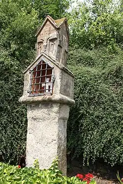 Die Inschrift lautet auf der Vorderseite: „1699, 24 MEI“. An der Seitenwand der Nische befindet sich folgender Text: „o mensch gedenck an got, der fur dich geliten hat, der her fur uber geet und her fur niederknit und her fur trit, fur die abgestorben bit [...] das creux hat die gemein gestelet alein, o mensh, halt dich rein“. Mit „gemein“ soll wohl ausgedrückt werden, dass die Gemeinde den Segenstein aufgestellt hat.