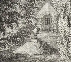 • Ein Vogelhaus in der Gestalt eines Pavillons stand gegenüber einer „Nische von lebendigem Grün“, umgeben von „Terrassen von Rasen“, Obstbäumen, Blumen und Sträuchern.