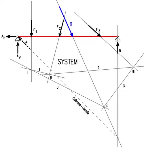 Im Beispiel ist ein Balken auf zwei Stützen A und B gegeben, an dem die Kräfte F1, F2 und F3 entsprechend der Skizze angreifen. Zunächst werden die Kräfte entsprechend der unteren Skizze maßstäblich als Kräftepfeile gezeichnet und geometrisch addiert. Dabei werden die Kräfte F1, F2 und F3 auf ihren Wirkungslinien fortlaufend aneinandergereiht so dargestellt, dass auf eine Pfeilspitze der Pfeilanfang der nächsten Kraft folgt. Verbindet man den Pfeilbeginn von Kraft F1 mit der Pfeilspitze von Kraft F3, so erhält man die resultierende Kraft R nach Größe und Richtung. Danach zieht man von einem beliebig gewählten Punkt, dem Pol S sogenannte Polstrahlen (Verbindungslinien) zu den Enden der einzelnen Kräftepfeile und nummeriert sie fortlaufend. Die so entstandenen Dreiecke stellen Kraftecke dar, deren Polstrahlen sich mit den zugehörigen Kräften in den Punkten I,II, III und P der oberen Skizze schneiden.