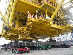Eine Förderplattform wird mit drei Reihen von SPMTs transportiert