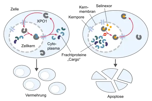 Selinexor ist ein Arzneistoff aus der Klasse der XPO1-Hemmer und wird in der Krebsbehandlung eingesetzt. Es blockiert die Wirkung von Exportin 1 (XPO1), das Proteine vom Zellkern in das Zytoplasma einer Zelle transportiert. Einige Zellproteine müssen sich im Zellkern befinden, damit sie richtig funktionieren. Indem Selinexor die Funktion von XPO1 blockiert, verhindert es den Austritt bestimmter Proteine aus dem Zellkern, stört das weitere Wachstum der Krebszellen und führt zum Absterben der Krebszellen.[3]