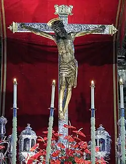 Die ursprüngliche Skulptur wurde um 1680 von dem Holzschnitzer Lázaro González geschaffen und von dem Maler Cristóbal Hernández gefasst. Dieses Werk wurde durch den Brand der Kirche San Agustin 1964 zerstört. Der Bildhauer und Restaurator Ezequiel de León Domínguez schuf eine dem Original sehr nahekommende Kopie.[5] Das Kruzifix hängt in der Kathedrale. Der Paso steht unter der Obhut der Cofradía del Santísimo Cristo de Burgos y de Nuestra Señora de la Cinta. Die Feier mit der anschließenden Prozession findet um 18:30 Uhr in der Kathedrale statt.