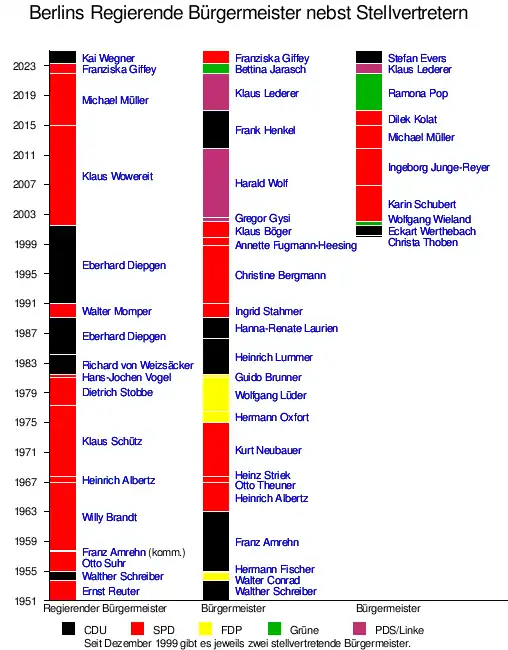 Derzeitiger Regierender Bürgermeister ist seit 2023 der CDU-Politiker Kai Wegner, der einer Koalition aus CDU und SPD vorsteht, die infolge der Wiederholungswahl zum Abgeordnetenhaus am 12. Februar 2023 gebildet wurde und ihre Arbeit am 27. April 2023 aufnahm. Dem amtierenden Senat gehören neben Wegner je fünf Senatoren von CDU und SPD an.