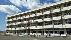Südseite der Grundschule Sendai-Arahama in Wakabayashi-ku. Sie diente während der Katastrophe als ausgewiesene Evakuierungsstätte und wurde nachher als Erinnerungsstätte erhalten.[23][13][24][1] (Foto: 2. Mai 2017)