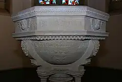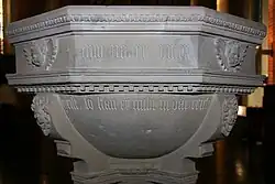 Im Jahr 1870 wurde jedoch für die neue Kirche von einem „örtlichen Gutshof“[8] ein neugotischer Taufbrunnen mit einem durchscheinenden Kristall gestiftet.[9] Diese Stiftung war wahrscheinlich der Anlass, dass Sendenhorst der Gemeinde Westkirchen den alten, hier so bezeichneten Sendenhorster Taufstein schenkte, da man zwei Taufsteine nicht benötigte und einer entbehrlich war.[10] Wie der Inschrift zu entnehmen ist, erfolgte die Schenkung der Pfarre Sendenhorst an die Gemeinde in Westkirchen dann im Jahr 1871 durch einen Pfarrer namens Reinermann. Damit kann nur Pfarrer Johann Reinermann aus Emsdetten gemeint sein, der von 1865 bis 1872 Pfarrer der Gemeinde war.[11] Seitdem befindet sich der Stein in der Laurentiuskirche.[12]