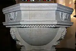 Fuß, Ständer und Becken haben zusammen eine Höhe von 1,28 Metern, die Beckenweite beträgt 87 Zentimeter. Das Becken mit Inschriften und Wappen ruht zusätzlich auf vier kleinen Säulen. An den angewinkelten Haltearmen der Säulen sind kleine Engelköpfe angebracht, jeweils oberhalb eines Engelkopfes zwischen den Gesimsen befindet sich ein Putto. Der Bereich zwischen den Gesimsen ist breit, am Fuß und Ständer befinden sich zudem kräftige Profile, an Letzterem befinden sich zylindrische Knoten mit Piqué-Mustern.[1]