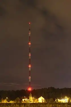 Seit 1962 trägt der Sendemast auch Antennen für UKW-Hörfunk. Zunächst wurde im OIRT-Band gesendet, seit 2007 wird das in Europa übliche CCIR-Band verwendet. Seit Juli 2008 wird auch Fernsehen für den Großraum Warschau ausgestrahlt.[3] Hierzu wurden auf dem obersten Mastsegment entsprechende Antennen für das VHF- und UHF-Band montiert.[4] Ab dem 1. Juli 2008 startete zunächst Polsat mit der Ausstrahlung, drei Wochen später folgten die übrigen Programme. Vor der Inbetriebnahme des Fernsehsenders in Raszyn erfolgte die Ausstrahlung vom Kulturpalast in Warschau.