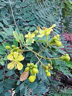 - Senna ×floribunda (Cav.) H.S.Irwin & Barneby (Hybride aus Senna septemtrionalis × Senna multiglandulosa, Syn.: Cassia corymbosa var. plurijuga Benth., Cassia floribunda Cav.)