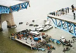 Die Brücke stürzte am 21. Oktober 1994 um 7:40 Uhr ein[2]. Aufgrund eines falschen Schweißverfahrens kam es zu einem Strukturversagen der Konstruktion, wodurch ein 48 m breites Teilstück 17 Meter tief in den Fluss stürzte. Dabei wurden ein Bus, ein Lieferwagen und zwei Pkw in die Tiefe gerissen, es kamen 32 Menschen ums Leben und 17 wurden verletzt. An der Suchaktion im Fluss, die durch Regen und Wind erschwert wurde, beteiligten sich auch zahlreiche kleinere zivile Boote.[3] Das Teilstück versank wegen der jahreszeitlich bedingten geringen Wassertiefe nicht komplett im Fluss, sondern blieb sichtbar.
