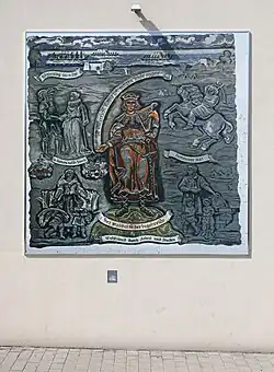 • 1950 Putzrelief auf der südlichen Außenmauer des Turnsaales der Hauptschule Zwentendorf an der Donau, durch Abriss verkommen. Kopie (Planendruck) auf der östlichen Außenmauer der Volksschule in Zwentendorf an der Donau