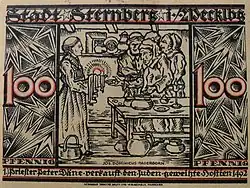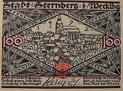 Im Jahre 1922 druckte die Stadt Sternberg, so wie viele andere deutsche Städte in der Weimarer Republik auch, eine Serie eigener Notgeldscheine. Die Vorderseite zeigt einheitlich eine Stadtansicht von 1492. Für die Rückseiten wählte man Darstellungen aus der Legende vom Sternberger Hostienfrevel. Die Ausgabe der Sternberger Notgeldscheine erfolgte kommentarlos „als handele es sich dabei um eine historische, wahrheitsgemäße Begebenheit.“[2]