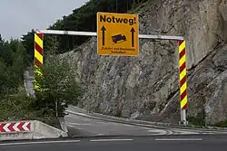 Um den Verkehrsteilnehmer auf diese Gefahren hinzuweisen, wird in der Regel eine entsprechende Beschilderung (Geschwindigkeitsbeschränkung, Überholverbot etc.) angebracht. Zur Verdeutlichung der Straßenführung und zur besseren Trennung des Gegenverkehrs ist in vielen Fällen zusätzlich eine Fahrbahnmarkierung vorhanden. Seitlich angeordnete Absturzsicherungen (Schutzplanken oder Betonschutzwände) sollen den Absturz beim Abkommen von der Fahrbahn verhindern. Insbesondere an Serpentinenstrecken, die von LKW befahren werden dürfen, können in regelmäßigen Abständen zudem Notwege vorhanden sein, die als Auslaufzone für talwärts fahrende Fahrzeuge mit einem Defekt an der Bremsanlage dienen.