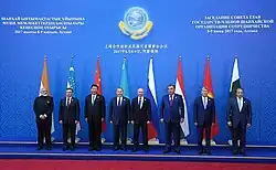 Die Schanghaier oder Shanghaier Organisation für Zusammenarbeit (SOZ; englisch Shanghai Cooperation Organisation, SCO) ist eine Internationale Organisation mit Sitz in Peking (China). Sie wurde 2001 gegründet und ging aus den 1996 gegründeten Shanghai Five hervor. Ihr gehören derzeit Belarus, die Volksrepublik China, Indien, Iran, Kasachstan, Kirgisistan, Pakistan, Russland, Tadschikistan und Usbekistan an. Die SOZ beschäftigt sich mit der sicherheitspolitischen Zusammenarbeit der Mitgliedstaaten sowie Wirtschafts- und Handelsfragen und der Stabilität in der Region. Derzeit nimmt die SOZ in Anspruch, circa 40 % der Weltbevölkerung zu vertreten, und stellt damit die weltweit größte Regionalorganisation dar. Seit Dezember 2004 hat die SOZ Beobachterstatus bei den Vereinten Nationen.[1] Die Schanghaier Organisation für Zusammenarbeit ist zum Bestandteil einer geopolitischen Alternative des chinesischen Präsidenten Xi Jinping und des russischen Präsidenten Wladimir Putin zur westlich geprägten Weltordnung geworden.