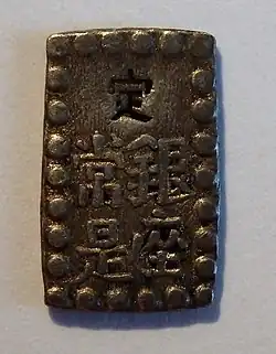 Diese nach dem alten System geprägten Münzen waren nicht rund, sondern rechteckig, selten auch quadratisch ausgeprägt. Nur die Kupfer- und Eisenmünzen, das Kleingeld, wurde nach chinesischem Vorbild rund mit quadratischen Loch in der Mitte hergestellt. Die Gestaltung war bildlos. Ein Schriftzeichen konnte statt geprägt, auch gepunzt worden sein.