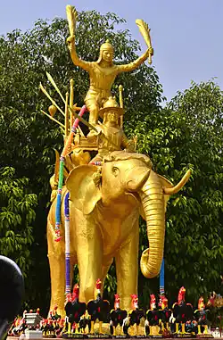 ![]() Elefantenduell zwischen Mingyi Swa und Naresuan in der Schlacht von Nong Sarai (Maurice Collis, 1943, nach einem siamesischen Gemälde aus dem 17./18. Jh.) | |||||||||||||