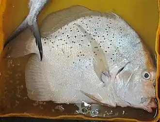 - Punktierter Sichelfisch (Drepane punctata) Linnaeus, 1758, 50 cm lang. lebt im Indopazifik, von Indien bis Nordaustralien, Neuguinea, Indonesien, Philippinen, Taiwan und Japan.