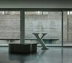 An der Fensterfront des Erdgeschosses auf der Südseite sind drei übergrosse, dreidimensionale Serifen-Schriftzeichen aus weissem Kunststoff platziert: Ein stehendes, rund einen Meter hohes x, ein liegendes l und eine liegende Ligatur ſi. Die Fensterfronten sind mit Buchstaben und Zeichen aus weisser Folie beklebt. Teilweise sind darin Satzfragmente erkennbar.