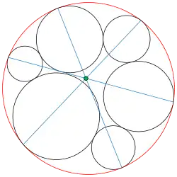 Der Sieben-Kreise-Satz besagt in der Geometrie, dass wenn in einer geschlossenen Kette von sechs Kreisen jeder seinen Vorgänger und Nachfolger sowie einen festen Kreis berührt, die zwischen gegenüberliegenden Paaren von Berührungspunkten auf dem festen Kreis gezogenen Linien durch einen Punkt führen. Der Satz wurde 1974 entdeckt[1] und 1978 bewiesen.[2]