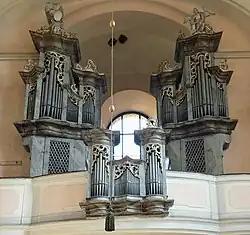 Die mit zweigeteiltem Prospekt zuseiten des Westfensters aufgestellte Orgel wurde 1793 von Anton Reiss aus Prag erbaut und hat sich weitgehend in unverändertem Zustand erhalten. Das Werk wurde 1888 durch den Orgelbauer Johann Fischpera aus Schüttenhofen überholt.[1] 2019–2022 fand eine Gesamtrestaurierung durch Dalibor Michek statt. Ihre Disposition lautet:[2]