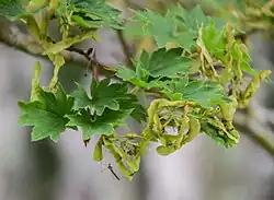 Die gegenständig an den Zweigen angeordneten Laubblätter sind in Blattstiel und -spreite gegliedert. Der rinnige Blattstiel ist 2,5 bis 5 Zentimeter lang, anfangs weich behaart und später oft kahl. Die leicht ledrige Blattspreite ist bei einer Breite von 2 bis 10 Zentimetern im Umriss rundlich mit herzförmiger bis fast gestutzter Spreitenbasis und sieben- bis elflappig. Die Blattspreite ist gelappt bis gespalten. Die Blattlappen sind eiförmig mit spitzem bis zugespitztem oberen Ende. Der Blattrand ist spitzig doppelt gesägt. Die Blattnerven sind auf der Blattunterseite behaart. Die Oberseite ist mattgrün und kahl, die Unterseite ist heller und grau-grün sowie auf den Adern behaart. Der Stiel- bzw. Aderansatz ist ober- und unterseits behaart. Die Laubblätter färben sich im Herbst kupferrot bis glänzend dunkelrot.